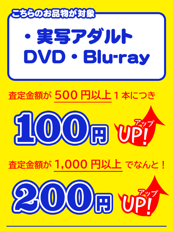 対象機種: 実写アダルト Blu-ray / DVD ・買取金額 500円以上 1点につき +100円アップ ・買取金額 1,000円以上 1点につき +200円アップ