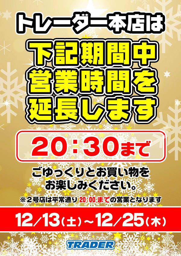 12/13(土)〜12/25(木) の間は、トレーダー本店のみ営業時間を30分延長して